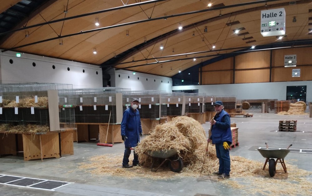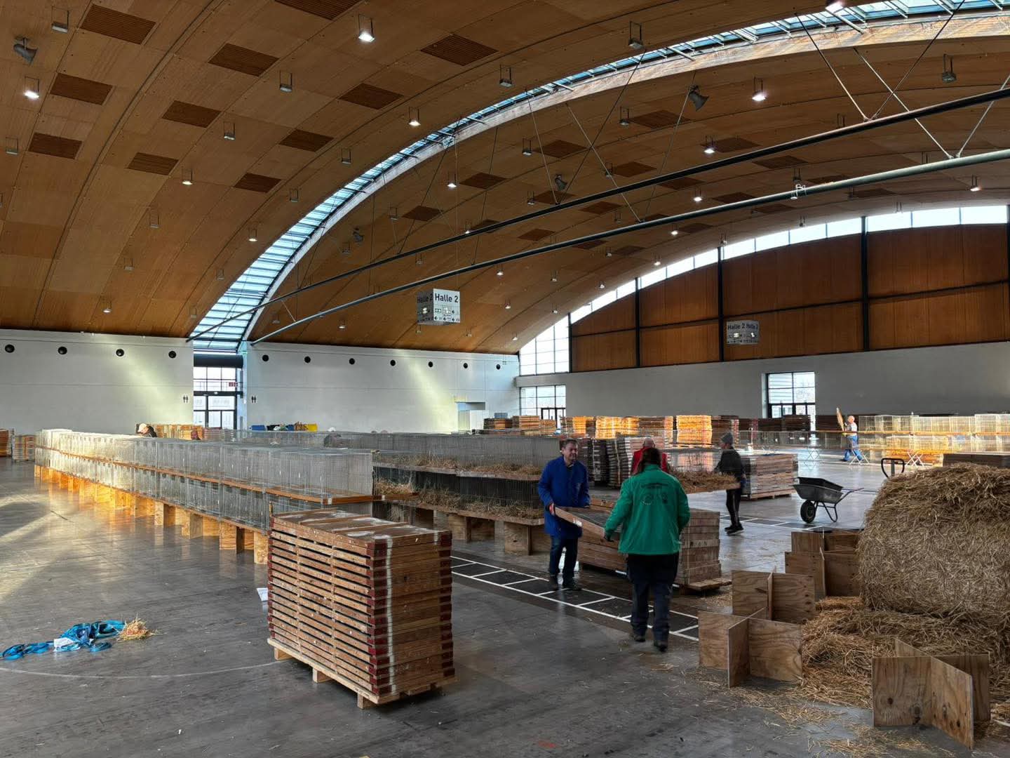 1. Aufbautag am 12.12.2025 heute auf dem Programm: Käfige aufbauen und einstreuen sowie Wellpappe an den Rückwänden anbringen.