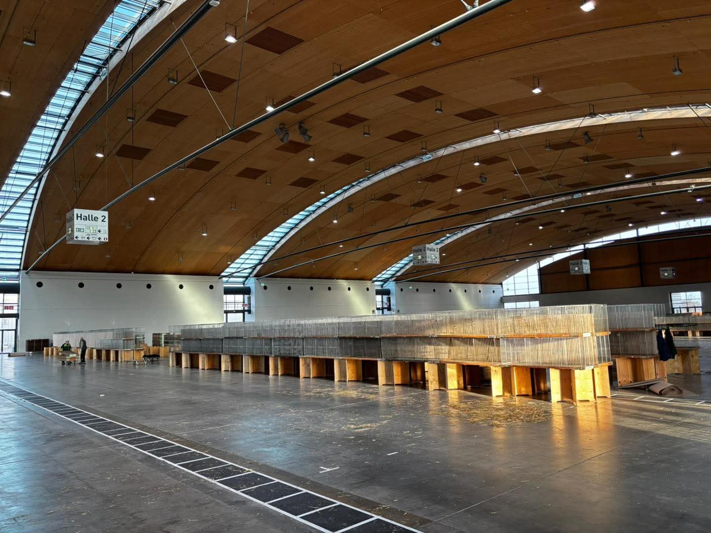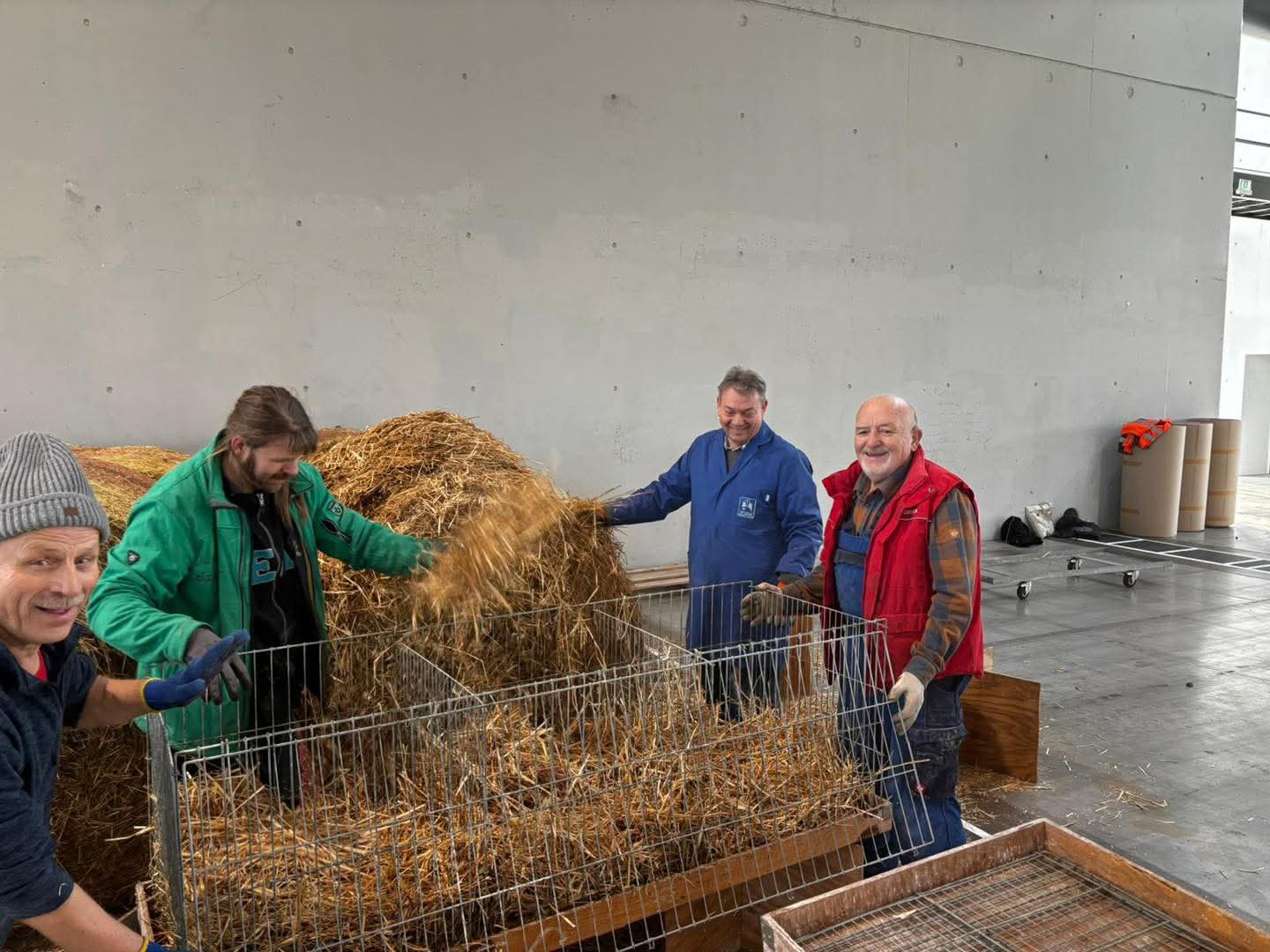 1. Aufbautag am 12.12.2025 heute auf dem Programm: Käfige aufbauen und einstreuen sowie Wellpappe an den Rückwänden anbringen.